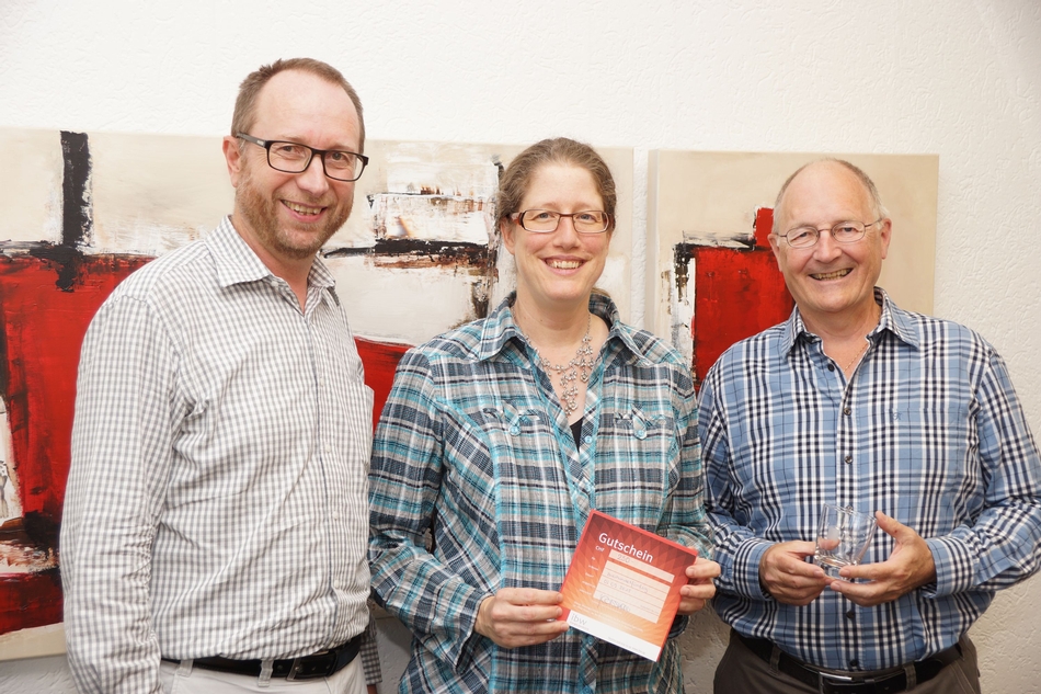 Der richtigen Zahl am nächsten kamen Peter Burri (rechts) sowie Isabelle Blättler (Mitte), beide aus Wohlen. Am 21. September übergab Beat Koch (links), OK-Präsident des «Tags der offenen Quellen», den Gewinnern ihre Preise: Peter Burri erhält ein Jahr lang gratis Mineralwasser frei Haus geliefert, Isabelle Blättler darf für CHF 250.– im «Rote Huus», dem Elektrofachgeschäft der ibw, einkaufen.