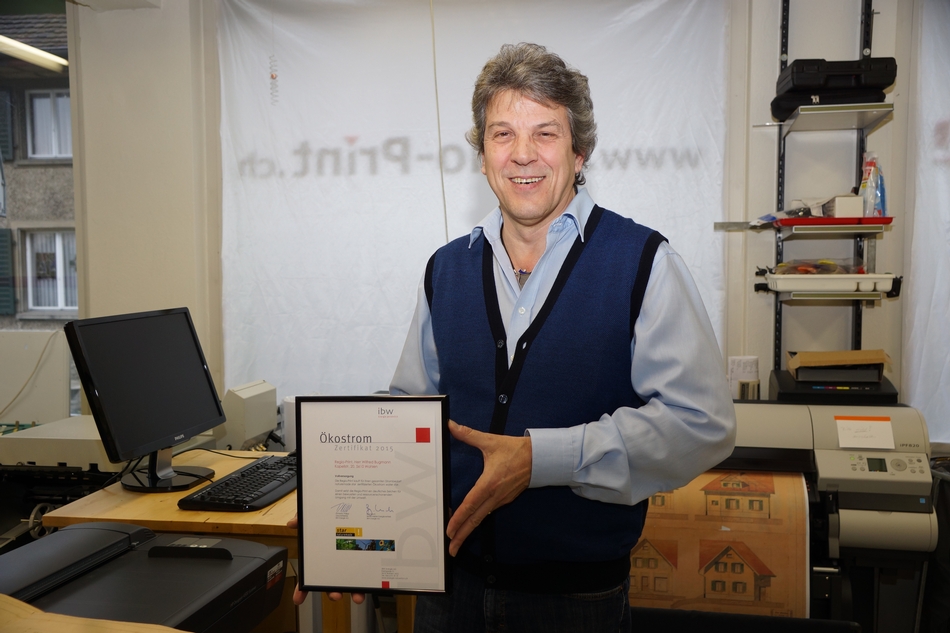 Seit vergangenem Jahr druckt das Wohler Digital-Druck-Center Regio-Print ausschliesslich mit «naturemade star»-zertifiziertem Ökostrom der ibw. Für Inhaber Wilfred Bugmann ist dies eine logische Folge des konsequenten Engagements für die Umwelt, das er sowohl in seinem privaten wie auch im geschäftlichen Alltag verfolgt.